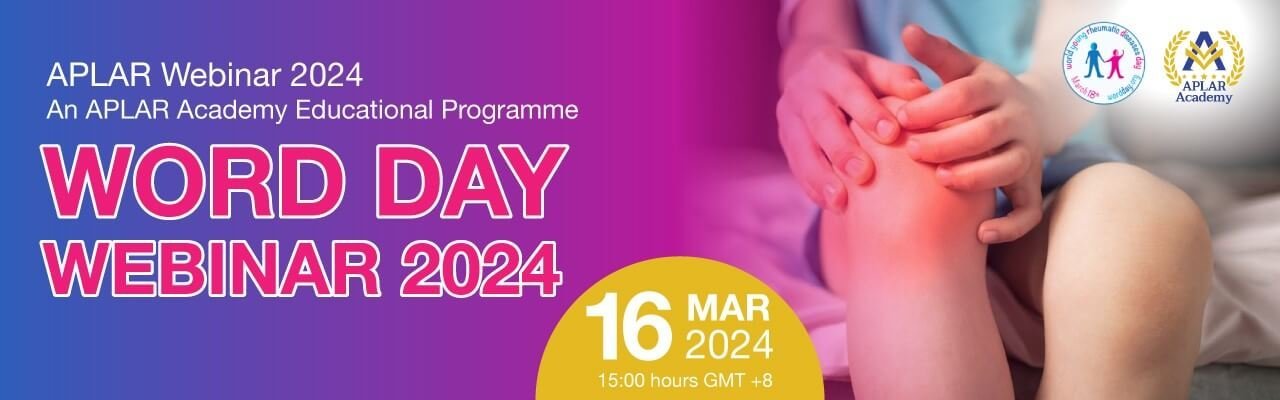 Home Events - Asia Pacific League of Associations for Rheumatology (APLAR) Past Webinar APLAR Academy Webinar 2024 in observing World Young Rheumatology Diseases (WORD) Local Time Timezone: America/New_York Date: 16 Mar 2024 Time: 3:00 AM - 4:30 AM Category Past Webinar Date 16 Mar 2024 Expired! Time 3:00 PM - 4:30 PM APLAR Academy Webinar 2024 in observing World Young Rheumatology Diseases (WORD) Recording: Here Share this event + Add to Google Calendar + iCal / Outlook export The event is finished.